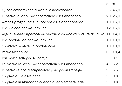Todas las mujeres entrevistadas procedían de hogares empobrecidos y casi la mitad quedaron embarazadas durante su adolescencia. Esto hizo que buscasen desesperadamente una fuente de ingresos, ya que no contaban con ningún apoyo y debían alimentar a un hijo que siempre tenía hambre. En algunos casos su pareja les abandonó o fue asesinada, en otros casos ellas escaparon de una relación sentimental violenta. Sus familias estaban tan empobrecidas que no podían hacerse cargo de una boca más que alimentar. Además, por ser NNA no eran admitidas en ningún empleo formal:
