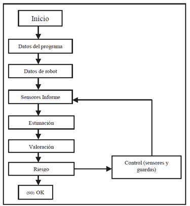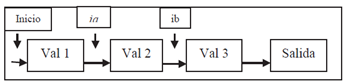 Para la representación de las partes del sistema de control del módulo de seguridad, se utilizan diagramas de bloques lógicos; en la figura 2, donde ia e ib representan los medios de interconexión, eventos de iniciación (ejemplo señal de interruptor de seguridad) y eventos de salidas en los robots (ejemplo actuadores, frenos etc.); en cada proceso el sistema de mando de seguridad, tendrá que ser validado (Val).
