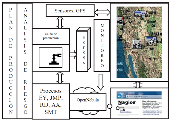 Módulo nube: La comunicación de materiales, maquinaria, operarios debe estar bajo la plataforma de una nube, donde se almacenara información, virtualizará (debido a infraestructuras distribuidas), monitoreo y se le dará seguimiento de seguridad a todo el sistema ciberfisico. Es posible que existan nubes remotas, comunicándose con la nube principal; y comparta recursos y se reconfigure dinámicamente según la demanda. Para esto se utilizó OpenNebuba (Toraldo, 2013); es de código abierto y permite la gestión de infraestructuras en sistemas distribuidos y heterogéneos; incluyendo clúster, nubes hibridas etc. También tiene la capacidad de Grid Computacional (Yang Liu et al, 2017) es decir, manejar redes de clúster para información. Es por todo esto, que es necesario una nube dedicada; con estructura y configuraciones especificas la cual pueda reconfigurarse automáticamente. En este caso de estudio no fue posible probar dicha nube, ya que la empresa por cuestiones de seguridad no permite información al exterior, solo se hicieron pruebas simuladas.