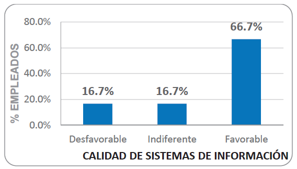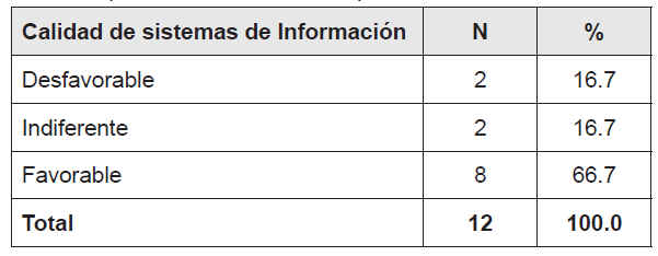 La dimensión calidad de los sistemas de información tuvo una percepción favorable (66.7%), mientas el 16.7% mostró una percepción desfavorable, en igual proporción los que manifestaron su indiferencia (16.7%). Este resultado se explica, porque los sistemas de información pueden ser modificados, corregidos y mejorados fácilmente, fáciles de aprender, fáciles de usar y contribuyen a la red de negocios y calidad de operaciones en las MyPES, sin embargo, aún es difícil tener acceso a la información que hay en los sistemas de información, así como los datos de un sistema de información no están actualizados. (Ver Tabla 4, Figura 3).