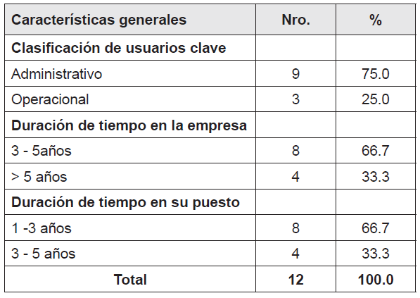 Como se observa en la Tabla 1, el 75% de los encuestados fueron personal administrativo de la empresa y 25% personal operativo. Donde la mayoría, tenía entre 3 y 5 años de permanencia laboral (66.7%) y la duración más frecuente en su puesto fue entre 1 y 3 años (66.7%).