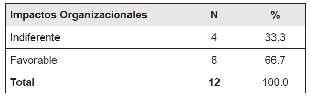 La evaluación de la dimensión impacto organizacional de los sistemas de información en las MyPES fue favorable, porque han incrementado la capacidad de la empresa y ha mejorado algún producto o servicio en la mayoría de las MyPES, sin embargo, aún no han funcionado en la reducción de costos.