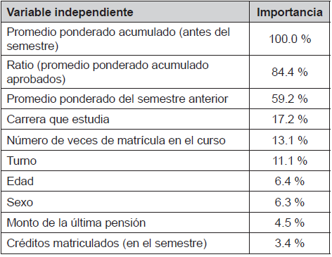 Posteriormente se utilizó la metodología CRISP (Cross-Industry Standard Process for Data Mining), la cual incluye seis etapas como proceso de modelamiento para determinar una selección de las mejores variables predictoras del buen rendimiento académico. Seguidamente, se aplicó el método de crecimiento árboles de clasificación y regresión (Classification and Regression Trees), para dividir los datos en segmentos con la finalidad de que sean lo más homogéneos posibles respecto a la deserción para el análisis de clasificación exploratorios y confirmatorios. Entre las variables identificadas con mayor recurrencia están: género, edad, tipo de colegio, promedio académico ponderado, departamento del colegio de procedencia, ingreso familiar mensual y el monto de la pensión que pagan los estudiantes en la universidad privada (tabla 1).