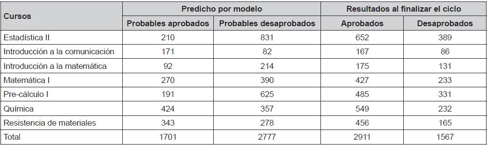 Los resultados obtenidos con la corrida de los siete modelos predictivos, diseñados para la presente investigación, predijo que 2777 estudiantes desaprobarían los siete cursos considerados en el estudio, de un total de 4478 jóvenes matriculados en las mencionadas asignaturas en ciclo académico 2016 II. Con dicha información la universidad, a través de sus oficinas de acompañamiento al estudiante, brindó apoyo durante todo el semestre académico al grupo de jóvenes con mayores probabilidades de reprobar y al finalizar el semestre lograron que 1210 estudiantes de ese grupo aprobaran y solo desaprobaron 1567 (tabla 2).