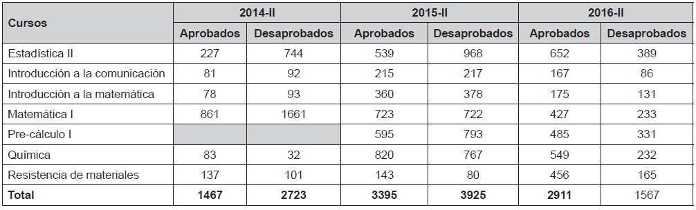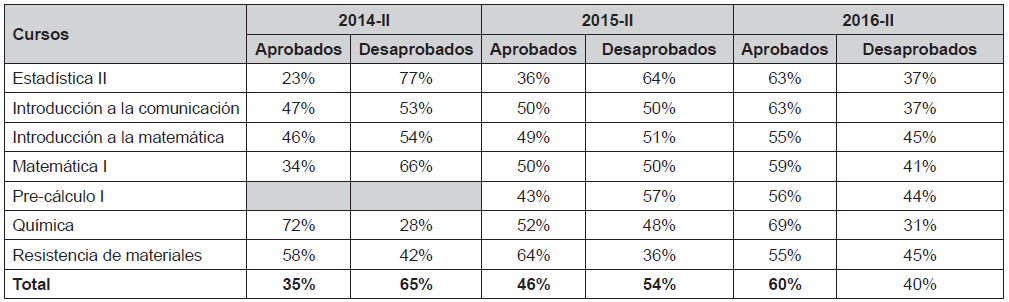 Las estadísticas de desaprobación de los últimos años muestran que se ha producido un ligero incremento en ese indicador, pero que a partir de la implementación de los modelos predictivos creados para los siete cursos calificados como críticos, así como la aplicación de estrategias de apoyo al estudiante, se ha reportado una disminución en el nivel de desaprobación, estimado como uno de los factores de la deserción. Las estadísticas de los siete cursos se muestran en la tabla 3, considerando que los modelos se implementaron en el periodo 2016-II.