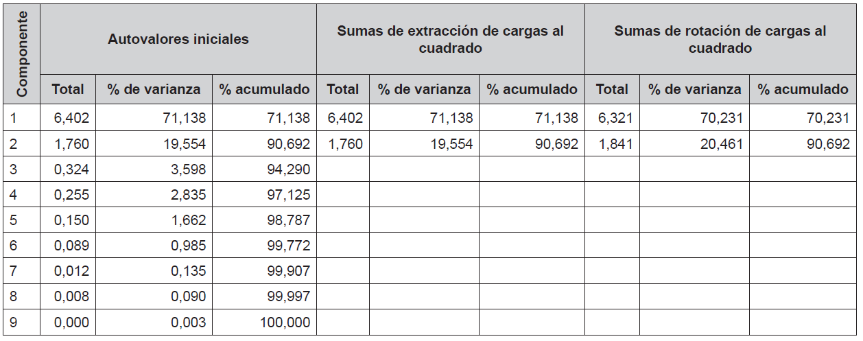 La tabla 9 muestra la matriz de componente rotado considerando que el método de extracción fue el de análisis de componentes principales. El método de rotación utilizado ha sido el Varimax con normalización Kaiser, en la que la rotación ha convergido en tres iteraciones.