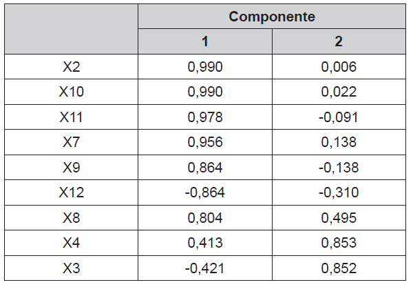 Finalmente, la matriz de componentes rotados, mostrada en la tabla 9, indica que la rotación ha convergido en tres iteraciones, lo cual nos lleva a un modelo con dos componentes principales, donde el primer componente es la variable con máxima varianza con solo dos coeficientes negativos.