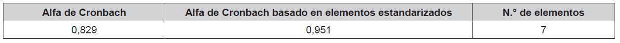Una práctica usual es determinar primero el valor del coeficiente alfa de Cronbach a fin de estimar la fiabilidad de los constructos. Sin embargo, habiendo utilizado información real, no procedente de encuestas o cuestionarios, el resultado ratificará la conclusión de que, en caso de uso de data real, el valor obtenido no descalifica la aplicación de una técnica multivariante (Lloret-Segura et al., 2014). El análisis de fiabilidad ha sido realizado utilizando el software estadístico SPSS 24. Mediante un análisis semejante al de la búsqueda de consistencia entre las respuestas de un cuestionario, se utiliza este coeficiente para determinar la consistencia entre los factores (variables) involucrados.