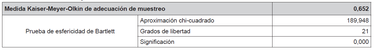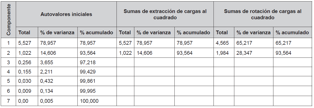 La tabla 6, como en el caso anterior, muestra que el 100% de los coeficientes de correlación son diferentes de cero, lo que implica que es posible continuar con el análisis. El método de extracción ha sido el de análisis de componentes principales.