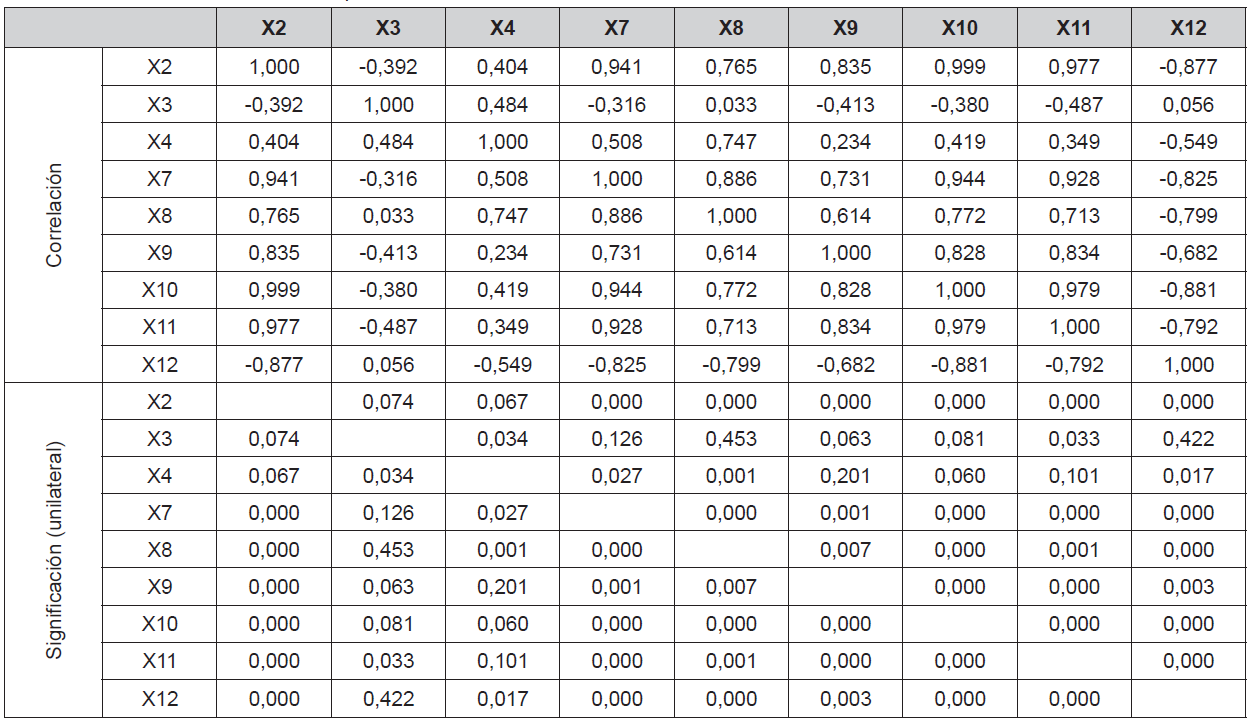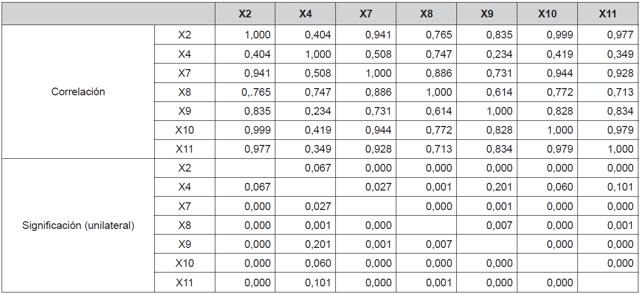 Se puede observar que X2 (producción de LGN), X10 (producción de GLP), X8 (capacidad de almacenamiento de GLP) y X7 (procesamiento de LGN) son variables altamente correlacionadas, puesto que el procesamiento de líquidos de gas natural dependerá de la producción de gas natural y, a su vez, de la producción de GLP. Asimismo, esta producción estará determinada por su capacidad de almacenamiento.