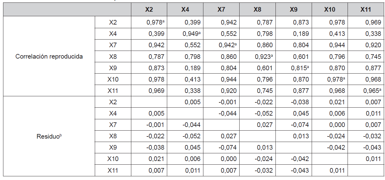 b. Los residuos se han calculado entre las correlaciones observadas y las reproducidas. Se ha observado cuatro (11,0%) residuos no redundantes con valor absoluto mayor que 0,05.