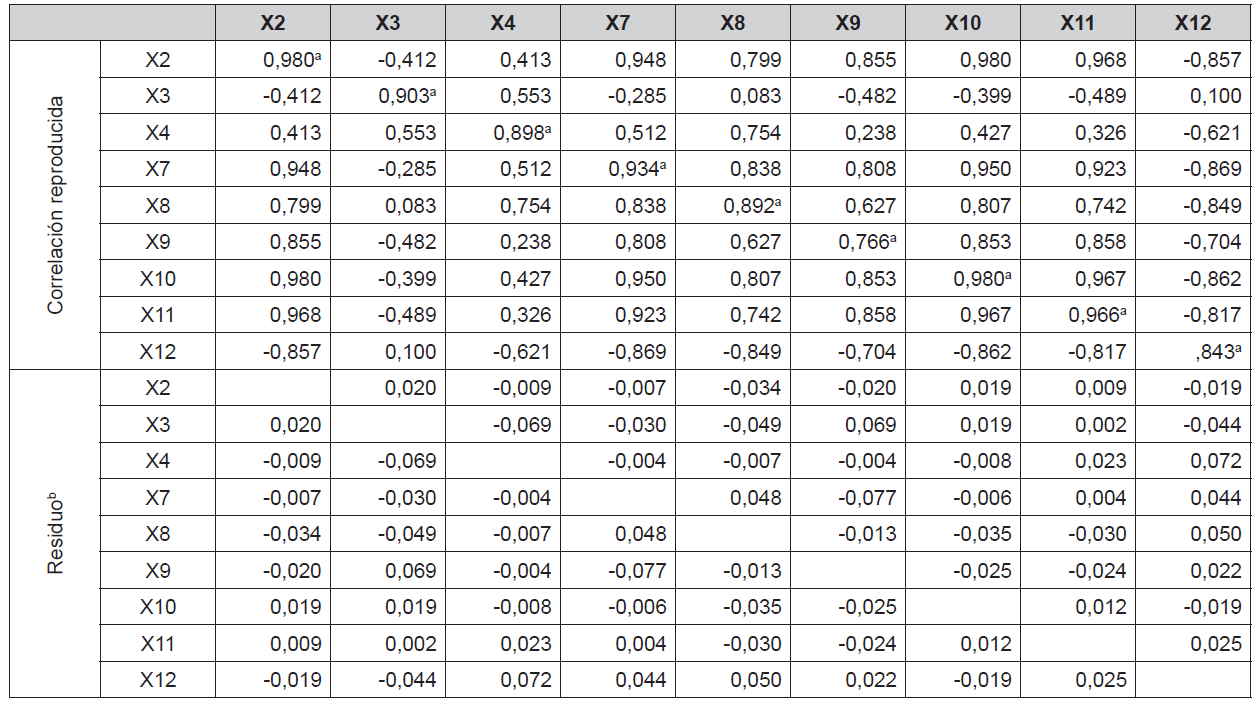 b. Los residuos se han calculado entre las correlaciones observadas y las reproducidas. Se ha encontrado dos (9,0%) residuos no redundantes con valores absolutos mayores que 0,05.