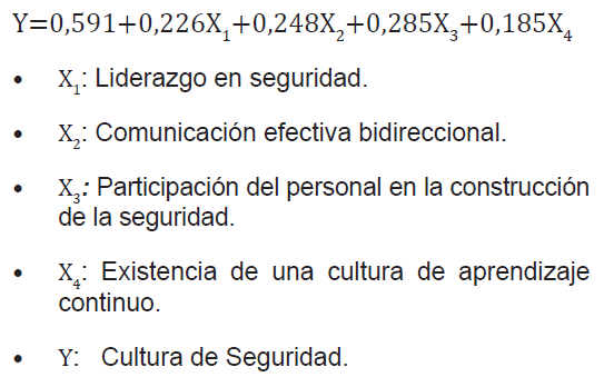 Finalmente, se llegó a establecer los coeficientes del modelo que explican la dependencia de Cultura de Seguridad respecto de las cuatro variables ya indicadas; estos coeficientes están incluidos en la tabla 8.