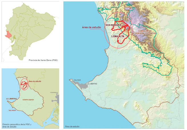 Aspectos geopolíticos. La PSE posee una extensión de 3762,8 km. y está dividida geopolíticamente por tres cantones: Santa Elena (3668,9 km.), Salinas (68,7 km.) y La Libertad (25,3 km.) (ver figura 1), donde Santa Elena es el cantón con mayor actividad agropecuaria, destinando el 14% de su superficie para cultivos y 6% para pastizal. Este cantón es el que posee, también, mayores recursos forestales, ya que al año 2008 indicaba una superficie de 31% como bosque nativo y 42% como vegetación arbustiva, mostrando un uso del suelo notable para la conservación (Gobierno Autónomo Descentralizado Municipal Santa Elena, 2014). En el cantón Santa Elena se eligieron dos localidades con áreas protegidas: la comuna Loma Alta (01º 52’S, 80º 38’O) (ver figura 1), la cual posee un bosque protector con 3218,19 ha, que es conocido como Reserva Ecológica Comunal Loma Alta; y, la comuna Dos Mangas (02º 07’S, 80º 18’O) (ver figura 1), que forma parte del bosque protector Chongón-Colonche y posee una superficie de 83 731 ha (Acción en el Biocorredor, 2012).