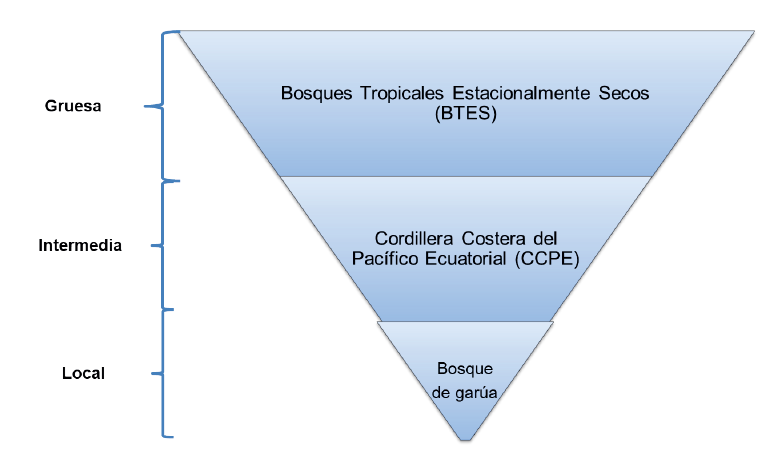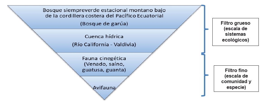 Acorde a las categorías y a los requisitos descritos por Granizo et al. (2006), se escogieron un total de ocho elementos en cada localidad, cuatro para cada tipo de objeto, y se empleó la técnica de filtro grueso-filtro fino para ayudarnos con la definición de los objetos. Esta técnica consiste en una pirámide invertida, donde se especifican cuatro escalas espaciales (regional, gruesa, intermedia y local) y se describen tres niveles de organización biológica (especies, comunidades y ecosistemas) (Groves et al., 2000). Lo que se presume con la utilización del filtro grueso-filtro fino, de acuerdo con Granizo et al. (2006), es que mediante el filtro grueso se protejan las comunidades y ecosistemas estratégicos que garanticen la funcionalidad y viabilidad de estos; mientras que, en el filtro fino, se conservarían aquellas especies que se encuentran en su interior o se escapan a la protección.