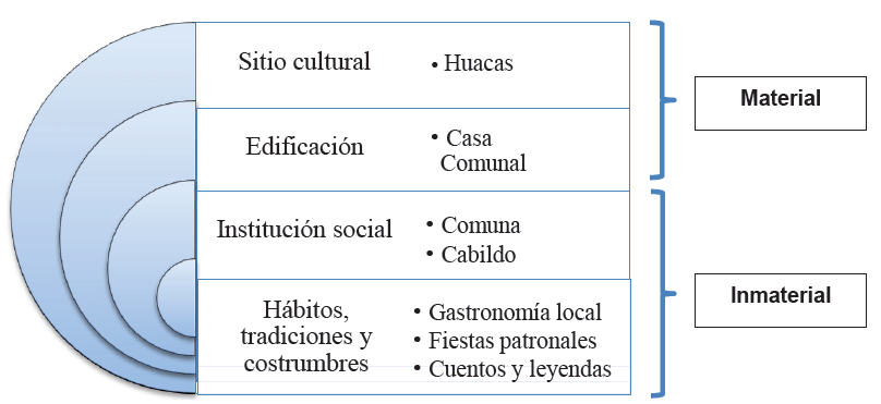 En referencia a los cuatro objetos de conservación culturales, los escogidos fueron: 1) gastronomía, los pobladores describieron platos típicos como el seco de guanta, seco de venado y el ceviche de chumumo como los más populares en las comunidades; 2) fiestas patronales, siendo la fundación de la comuna, Virgen de las Mercedes y día de los difuntos como las más celebradas; y, 3) restos arqueológicos (huacas). El cuarto objeto siempre fue fluctuante entre la edificación (e.g. casa comunal), la memoria colectiva (e.g. historia de la comuna), la institución social (e.g. comuna) y el conocimiento y prácticas locales (e.g. elaboración de artesanías en tagua y paja toquilla) (figura 4); de estos, el último es casi inexistente dentro de la comunidad de Loma Alta.