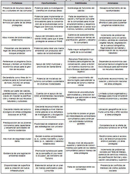 Para el desarrollo de estrategias, se requirió conocer las prioridades de conservación dentro de cada localidad; y, por ello, se empleó como herramienta la metodología de Planificación para la Conservación de Áreas (PCA), que incluye una fase de diagnóstico del área, cuyo primer paso es la selección de los objetos de conservación (Granizo et al., 2006). El diagnóstico, además, se complementó con la técnica de análisis FODA para determinar las potencialidades y limitaciones en el manejo, gestión y uso público de los recursos naturales y culturales de las comunas y sus áreas protegidas. El análisis FODA es una herramienta de planificación estratégica que evalúa los factores fuertes y débiles al interior de una organización o proyecto, así como las oportunidades y amenazas de su ambiente exterior y se presenta en una matriz base (Ponce, 2006).