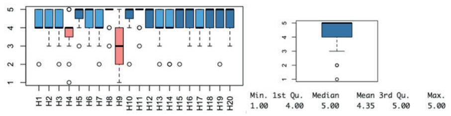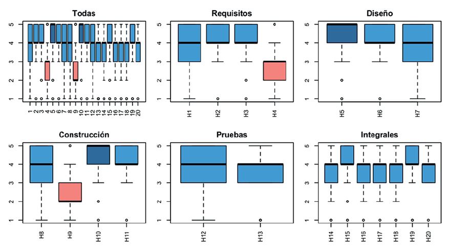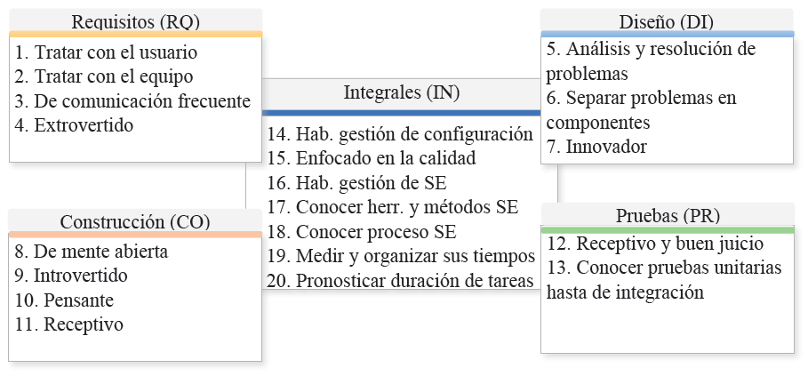 Las empresas consideraron importante que sus empleados involucrados en las fases del desarrollo de software cuenten con la mayoría de las habilidades cuestionadas. En general, existe una mediana de valoración 4; es decir, muy importante (ver Figura 2). Dos habilidades se descartaron, las de ser introvertido y de ser extrovertido, por no ser de mucha importancia. Sin embargo, se debe tener en cuenta que para algunas empresas sí tiene valor si una persona es extrovertida para el reclutamiento en la fase de requisitos.