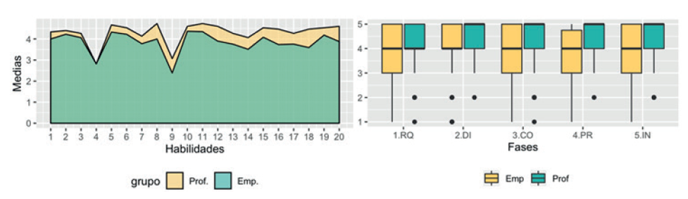 Al comparar los resultados de cada habilidad, se manifestó que la media de los profesionales superaba levemente lo requerido por la industria (ver Figura 5). El análisis de los resultados por cada fase de software indicó que la mediana de habilidades de los profesionales tiende a ser 5, mientras que la de la empresa se mantiene en 4, lo que señala que para la empresa las habilidades en cada fase son muy importantes y que los profesionales de PSP las tienen.