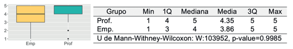 Habiendo confirmado la no normalidad de los datos, se aplicó el estadístico de prueba no paramétrica U de Mann-Withney-Wilcoxon (ver Figura 6), lo que resultó p-value = 0.9985; este dato confirma que la media de valoración de los profesionales es superior a la de lo requerido por la industria.