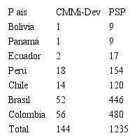 Para determinar el número de empresas a encuestar, se tomó en cuenta el reporte de empresas de certificados en CMMi-Dev, según el Ministerio de Tecnologías de la Información y las Comunicaciones (2015), por los países de la Tabla 1. Por cálculo de muestra estadística con N = 144, Z = 1.645, e = 6.6% y p = 50%, se llegó a un total de 49 empresas.