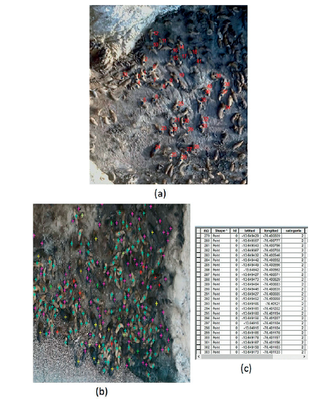 Se utilizó el programa ArcGis para visualizar las ortofotos generadas por el equipo RPA y su post proceso, de esta manera se realizaron los conteos de individuos de lobos marinos chuscos por categorías de sexo y edad en todas las playas de la isla, incluyendo los individuos ubicados en islotes, de manera que, de cada individuo registrado se obtuvo la información de georreferenciación.
