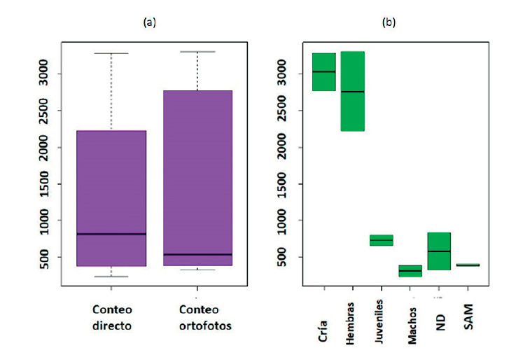 El conteo digital arrojó un resultado de 2700 individuos, mientras que el conteo directo fue de 2300 individuos. Aparentemente no se aprecia mayor diferencia entre los dos métodos de conteo, sin embargo, es posible visualizar mayor variabilidad en el conteo de las ortofotos tomadas con drones (Figura 11 a), asimismo con el conteo digital se pudo obtener un mayor detalle del número de individuos correspondientes a las categorías crías y hembras, a diferencia del resto de categorías registradas (Figura 11 b).