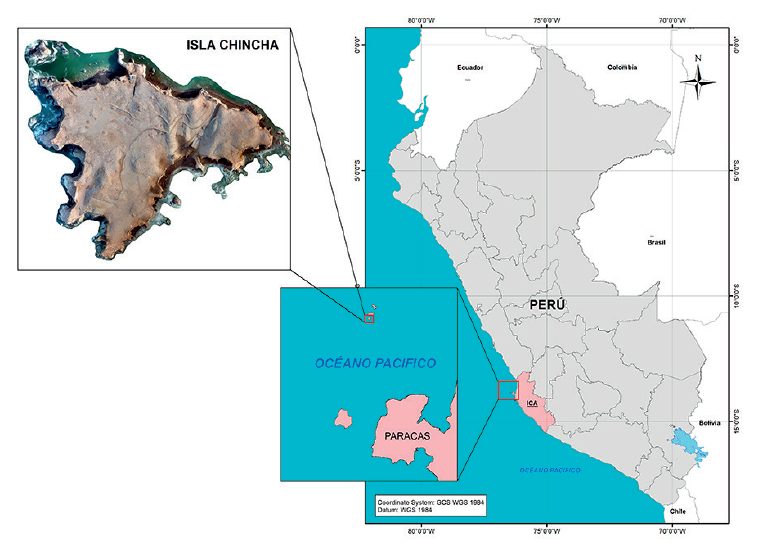 Este estudio se desarrolló el día 01 de marzo del 2019, en la isla Chincha Sur (-13.651225°, -76.401639°), ubicada a 21 km del puerto de San Andrés, en la ciudad de Pisco, Departamento de Ica (Figura 1).