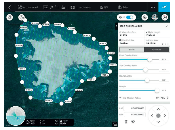 La primera tarea consistió en realizar un vuelo de reconocimiento RPA, sobre la zona de interés y alrededores, con la finalidad de establecer la altura de vuelo que permita generar un tamaño de pixel óptimo, que facilite la identificación de la especie de interés teniendo en consideración evitar la perturbación de la fauna del lugar.