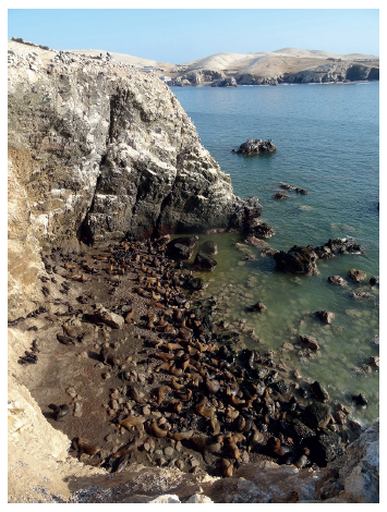 Se realizó el conteo de lobos marinos chuscos, mediante observación directa entre las 6:20 y 9:000 h utilizando binoculares de aumento 10x50 y contómetro desde la parte alta de los acantilados de la isla para tener una visión directa de las playas que albergan individuos (Figura 5).