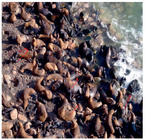 Se registró el número total de individuos de las playas (Arias-Schreiber y Rivas, 1998); los individuos censados fueron categorizados según edad y sexo en: machos adultos, machos subadultos, crías (individuos nacidos ese año), hembras adultas, juveniles, y no determinados, según sus respectivos caracteres secundarios (Vaz-Ferreira, 1982; Oliva et al., 2012) (Figura 6).