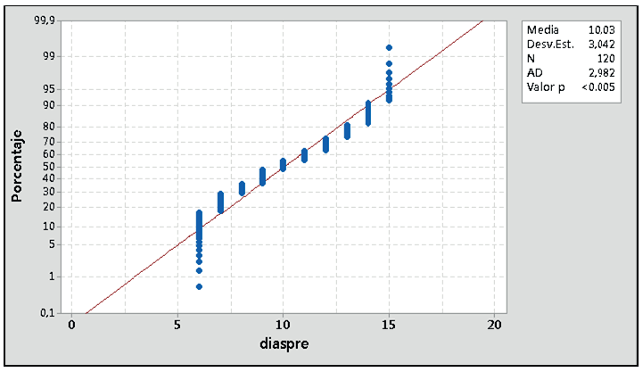 De acuerdo al valor de la Curtosis -1.33, se puede decir que la distribución es platicúrtica; es decir, la distribución es más achatada que la distribución normal (Pérez, 2018). Luego de ello se analizó la normalidad de los datos: