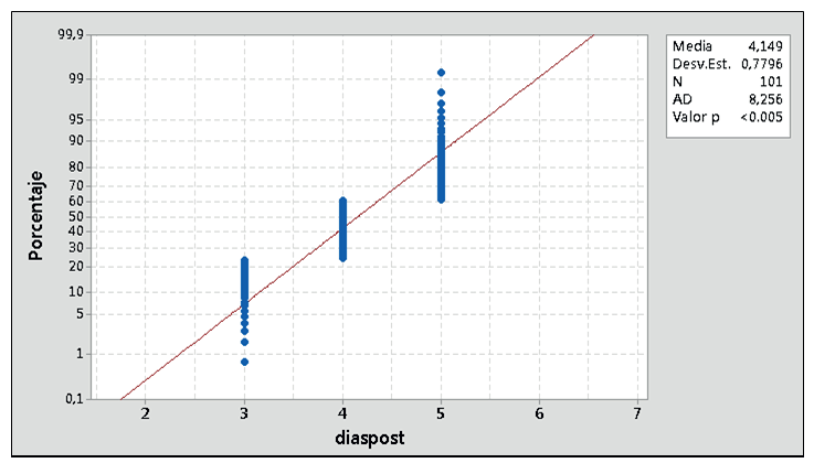 De acuerdo al gráfico mostrado el valor p es de 0.005; es decir, el valor p es menor a α: 0.05. Por lo tanto, se rechaza H. y se acepta H., los datos de la muestra pre test no son provienen de una distribución normal. Posteriormente se analizarán los datos luego de la implementación del sistema automatizado, estos datos se detallan a continuación en la situación pos test.