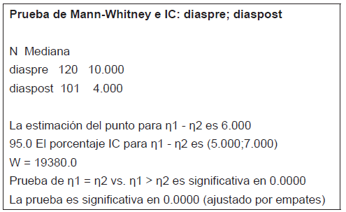 Según Xlstat (2016), como los datos de las muestras pre test y post test no siguen una distribución normal, se usó el Estadístico de Mann Whitney, que se usa para estadísticos no paramétricos.