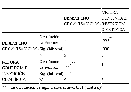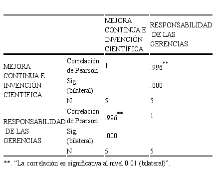 En esta prueba, lo que se ha buscado es comprobar si el modelo de desempeño, de acuerdo a las responsabilidades de las gerencias influyen en forma favorable con relación a la mejora continua e invención científica en las empresas del sector lácteo, su valor de correlación es de 0.996, existiendo una correlación muy favorable, y con un valor de significancia de 0.000 concluyendo que se acepta la hipótesis alterna y descartando la nula.