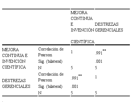 En esta prueba, lo que se ha buscado es comprobar si el modelo de desempeño, de acuerdo a las destrezas gerenciales influyen en forma favorable con relación a la mejora continua e invención científica en las empresas del sector lácteo, su valor de correlación es de 0.991, existiendo una correlación muy óptima, y con un grado de relevancia de 0.000 concluyendo que se admite la hipótesis alterna y descartando la nula.