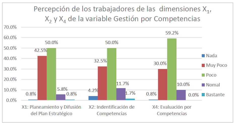 Finalmente, la cuarta dimensión Evaluación por competencias (X4), el 58.2% tuvo una percepción de “Poco”, un 30% de “Muy poco” y un 0.8% de “Nada”. Es decir, El 93.3% evidenció una percepción negativa respecto al Planeamiento y Difusión del Plan estratégico en la organización (Ver fig. 1).