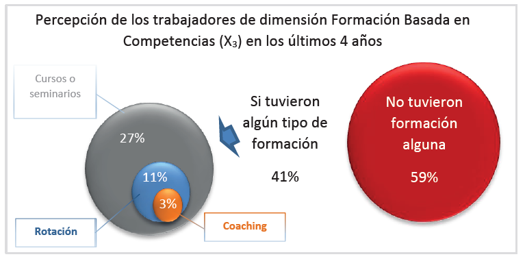 La dimensión Formación Basada en Competencias (X3) se diseñó para la investigación de tipo dicotómica, razón por la cual muestra los siguientes resultados (Ver figura 2): El 59% de los trabajadores señaló no haber recibido formación alguna mientras que el 41% que consideraron haber recibido algún tipo de formación. El 27% recibió cursos o seminarios orientados a mejorar sus competencias, 11% fueron rotados además de haber recibido cursos o seminarios. Solo el 3% indicó haber recibido coaching, fueron rotados y llevaron cursos o seminarios.