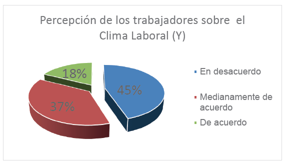 En la figura 3, se observa que el 45% de los encuestados se encuentran “En desacuerdo” con el clima laboral. El 37.5% estar “Medianamente de acuerdo” con el clima laboral, mientras que el 17.5% está “De acuerdo” con el clima laboral.