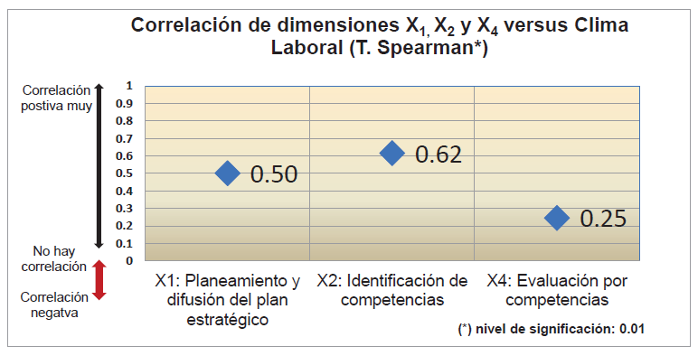 El resultado de las correlaciones de las dimensiones X1, X2 y X4 sometidas a la prueba de hipótesis específicas se muestra en la figura 4. Se observa que existe una correlación positiva alta de 0.501 entre el Planeamiento y Difusión del Plan Estratégico (X1) y el Clima laboral (Y) de los trabajadores en una empresa de servicios de consultoría y outsourcing. Así mismo, existe una correlación positiva alta de 0.616 entre la Identificación de Competencias (X2) y el Clima Laboral (Y). Respecto a la dimensión Evaluación por Competencias (X4) existe una correlación positiva moderada de 0.246 con un nivel con el clima laboral (Y). Las tres pruebas tienen un nivel de significación de 0.01