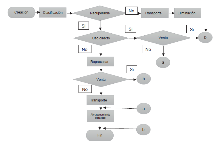 Con el fin de identificar mejor los residuos sólidos en un proyecto de construcción se ha elaborado la figura 1 que muestra un flujograma de las diferentes etapas por las que debe pasar los residuos. Esta va desde su creación en los proyectos, pasando por la clasificación para determinar que residuos pueden ser procesables o recuperables, como el fierro de construcción, los agregados etc. y cuáles deben ser enviados a los rellenos sanitarios oficiales. También hay una serie de materiales que son sobrantes de la obra (se generan por un mal diseño, malas especificaciones técnicas o mal metrado) que pueden ser reusados en otros proyectos o vendidos con el fin de recuperar algo de la inversión.