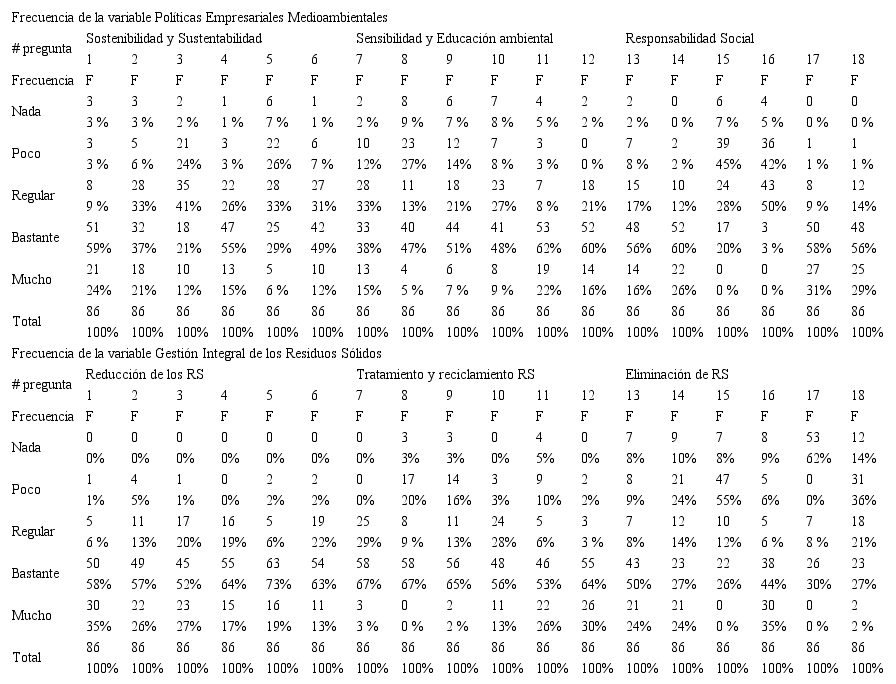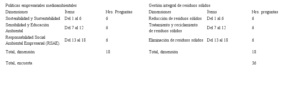 El estudio constó de dos partes, la primera correspondió a un análisis estadístico para probar la correlación entre las dos variables (PEM y GIRS) y la segunda de un análisis de las respuestas de los entrevistados. El análisis estadístico tuvo un enfoque del tipo cuantitativo, para lo cual se elaboró una encuesta de 36 preguntas, las cuales se muestran en el anexo adjunto, dividida en dos secciones: la primera con 18 preguntas relacionadas con la variable independiente PEM, las cuales incluye temas sobre políticas de Sostenibilidad y Sustentabilidad Ambiental, Sensibilidad y Educación Ambiental y Responsabilidad Social Empresarial. La segunda también tiene 18 preguntas e incluye las interrogantes relacionadas con la variable dependiente GIRS, divididas en temas de Reducción, Tratamiento-Reciclamiento y Eliminación de los Residuos Sólidos. El detalle de la distribución de las preguntas en la encuesta se muestra en la tabla 2: Distribución de preguntas por variables.