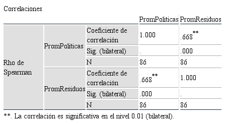 El resultado obtenido muestra una “correlación positiva considerable” de 0.668 entre las dos variables según la interpretación de Hernández et al. (2010) mostrado en la tabla 3. Por otro lado, el nivel de Sig. (bilateral) es 0.000 es menor al nivel de significancia de la prueba 0.05, por lo tanto, se rechaza la Hipótesis Nula (H.); como consecuencia se acepta la hipótesis alternativa que indica las PEM si inciden en la GIRS.