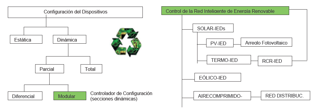 En este orden de ideas los IEDs han sido un tema de investigación, actualmente orientado hacia las redes inteligentes de energías, dando lugar al concepto de relés inteligentes, para la configuración del sistema de potencia híbrido, con características adaptativas. En esta investigación se plantean dos aspectos novedosos: La incorporación conceptual de R-IEDs, que permiten la configuración dinámica del dispositivo electrónico inteligente, dando además funciones de monitoreo, control y tele-configuración, para el soporte del manejo de los sistemas de potencia de forma remota. Solucionando así dos grandes retos actuales, tecnologías de soporte para el tele-trabajo en el área de ingeniería y electrónica reconfigurable para disminuir los residuos electrónicos producidos por el cambio tecnológico y actualización de los sistemas. Esto aporta a su vez, insumos para mitigar el impacto ambiental de las actividades industriales, permitiendo además la incorporación de energías renovables de forma eficiente, así como la aplicación de la tecnología FPGA para desarrollar el concepto de redes de energías renovables cognitivas y sus aportes en materia de tele-trabajo y mitigación de impacto ambiental.