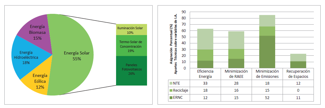 A partir del estudio se han identificado los aportes de cada alternativa de energía renovable y los porcentajes en la propuesta (Ver Figura 2), así como la disminución de emisiones de calor y contaminantes, con la implementación del tele-trabajo para disminuir el uso de combustibles fósiles en materia de movilidad. Se identifican técnicas como la reducción, a partir de disminuir los aspectos de impacto ambiental, la remediación, a través del reciclaje y la migración, usando NTE, a fin de realizar una acción preventiva, donde se corrige el impacto ambiental desde la etapa de desarrollo sostenible y diseño eco-responsable.
