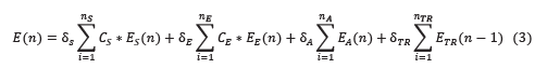 Se observa así un modelo híbrido de realimentación lineal. Donde la energía total del sistema ERNC con calor regenerativo, será el aporte de cada convertidor de energía, con un selector ponderado representado por el elemento de acople R-IED, representado por δ del componente correspondiente, la ganancia de cada rama ERNC viene dado por la lógica de control del IED en relación a los parámetros ambientales, condicionales, configuración remota y eficiencia de conversión. Para el modelo se han considerado los aportes de energía solar para n. elementos en el arreglo, la energía eólica para n. convertidores, cada una ponderada por el concentrador físico del montaje, tal es el caso de los convertidores eólicos donde se puede incorporar un concentradores de flujo, para aumentar la ganancia del convertidor o turbina eólica y , la energía en las unidades de almacenamiento para n., siendo estos configurados de forma bidireccional, como carga durante el almacenamiento y como fuente durante el suministro de energía a la micro-red. Finalmente, se considera el aporte de energía térmica residual (TR) en el instante n-1, que será realimentada al modelo de energía. Es importante resaltar que el modelo puede ser adaptado para otras aplicaciones industriales, en las que se puede manejar la configuración óptima en eficiencia energética para el sistema. Los coeficientes δ por cada aporte son configurados en el dispositivo IED, en este modelo se pueden habilitar de forma selectiva la incorporación a la red de cada rama, mediante el acoplado (PCC) de cada conversor de energía, se incorporan los elementos de almacenamiento para aire comprimido, calor regenerativo, o el método de almacenamiento de ERNC seleccionado, con ponderación de la realimentación al sistema circular de energía, presentado en la Figura 3.