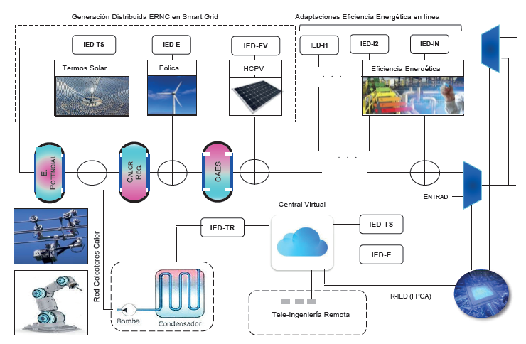 En el esquema observamos los R-IEDs como los elementos de acoplamiento bi-direccional de energías renovables y su optimización dinámica, en relación a las condiciones y demanda energética. A nivel centralizado se pueden implementar tecnologías de Recuperación de Calor Industrial, biomasa (a partir subproductos de post-cosecha), gestión de residuos sólidos, Termo-Solar de Concentración y Aire Comprimido AES, todo esto aplicando el potencial de la infraestructura existente y rediseñando las redes de distribución (cero Impacto Ambiental). A la vez el diseño de una plataforma distribuida de micro-convertidores/aplicaciones de energía neumática y térmica, de forma directa o indirecta., con el objetivo de disminuir el consumo de energía eléctrica. Estas tecnologías deben ser implementadas en conjunto con técnicas de remediación ambiental, recuperación de espacios verdes, paneles fito-remediación para descontaminación del aire y agua, para alcanzar los objetivos de desarrollo sostenible. Así mismo, los sistemas de monitoreo y soporte para tele-trabajo deberán ser diseñados con autonomía energética, incluyendo en el diseño mecanismos de seguridad para evitar riesgos en las tareas tele-operadas, a fin de contar con un compromiso entre el control distribuido configurado en los IEDs y la experiencia del talento humano en la coordinación de tareas, con gestión colaborativa (talento humano y elementos inteligentes remotos), garantizando los empleos del personal.