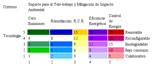 Para la selección de los cursos de capacitación y actualización con tecnología de robótica teleoperada (Gómez, García y Ollero, 2006), se consideran una serie de criterios básicos, relacionando la frecuencia de los mantenimientos, equipos críticos, nuevos equipos que conforman las centrales de energías renovables, así como el impacto de la capacitación técnica: eficiencia, costos de mantenimiento, riesgos del hardware (que será actualizado o reciclado, según los conceptos previamente discutidos), impacto ambiental de emisiones, riesgo del personal. Al momento de establecer las jerarquías colaborativas, para consolidar la plataforma de tele-trabajo, se deberán definir los criterios y prioridades para la toma de decisión basada en normas, con respaldo del personal, de forma remota. Estos criterios han sido resumidos en la Tabla 1.