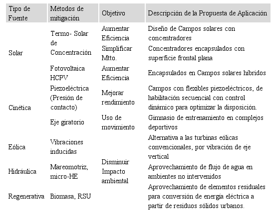 Entre los métodos se maneja la adaptabilidad a las nuevas tecnologías, usando para ello módulos electrónicos selectivos con coeficientes ajustables, eliminación de elementos de riesgo para la fauna local, disminución de consumo de agua y energía en procedimientos industriales, reutilización de recursos con tecnología de hardware circular e insumos reciclables. Estas técnicas van dirigidas al eco-desarrollo urbano (Sandoval-Ruiz, 2020e, 2018c) y su extrapolación al sector industrial hacia modelos sostenibles, partiendo de la investigación tecnológica, micro-conversión de energía eléctrica a partir de fuentes de energías renovables y los conceptos de ciudad inteligente, en los que se incorpora bit data y control de dispositivos en línea. En la temática energética, algunos métodos de mitigación de impacto ambiental basados en nuevas tecnologías emergentes NTE se presentan en la Tabla 2.