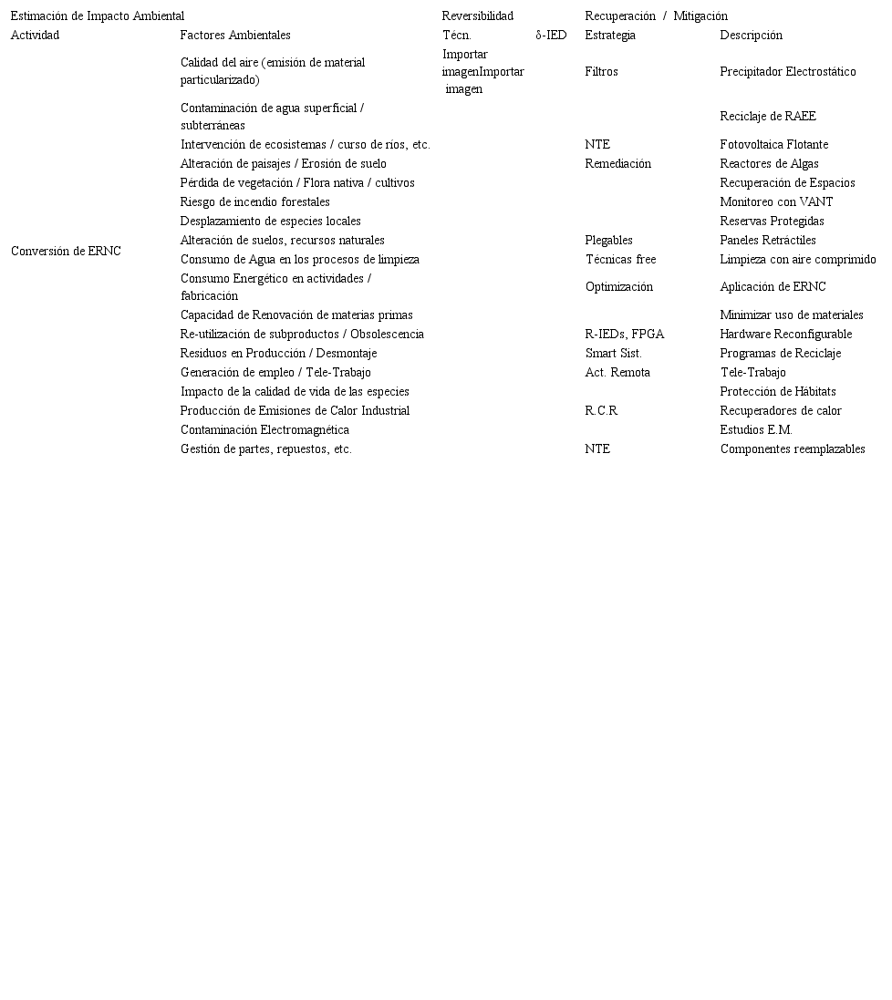Incorporando estas tecnologías de forma ética, bajo principios de sostenibilidad, se busca disminuir el impacto sobre el medio ambiente, simplificando y minimizando todas las actividades que demandan consumo de recursos no renovables, con un compromiso socio-ambiental RSE, en pro de mejorar las condiciones ambientales, con programas de protección a la fauna, bioremediación del entorno, tecnologías de mitigación del impacto ambiental, uso racional del suelo y recursos, eficiencia energética, disminución de emisiones de calor residual al ambiente, captación de calor y recuperación de calor industrial, para reciclaje energético, entre otras estrategias. Este trabajo presenta un estudio de impacto ambiental generalizado para diversos proyectos de ERNC, una revisión de tecnologías y propuesta de adaptación tecnológica, a través del concepto de optimización por enjambre de R-IEDs, con modelo de energías regenerativa como aporte matemático.